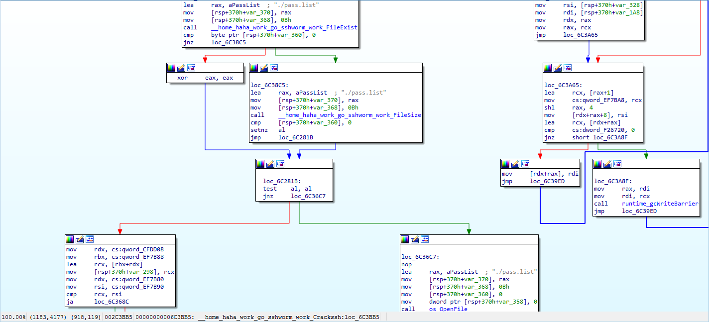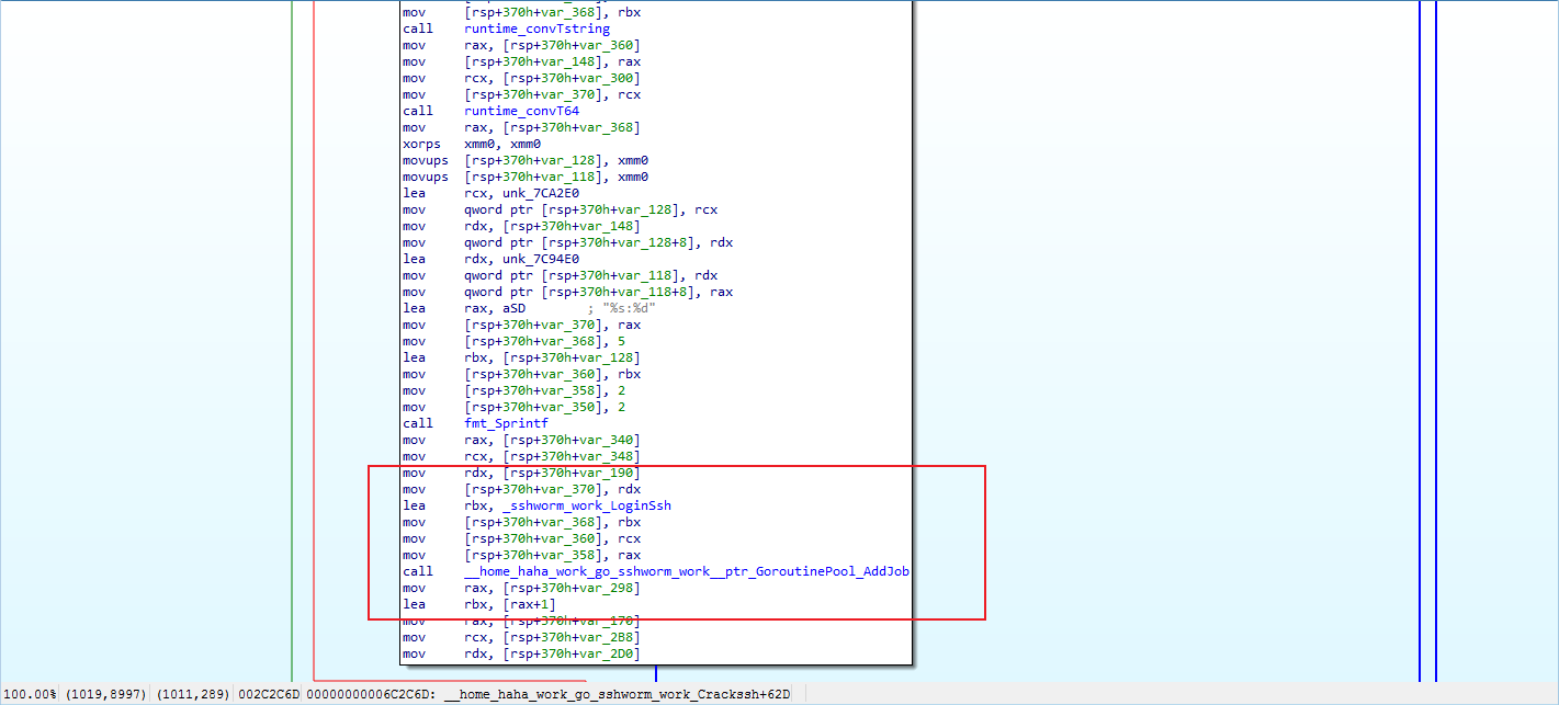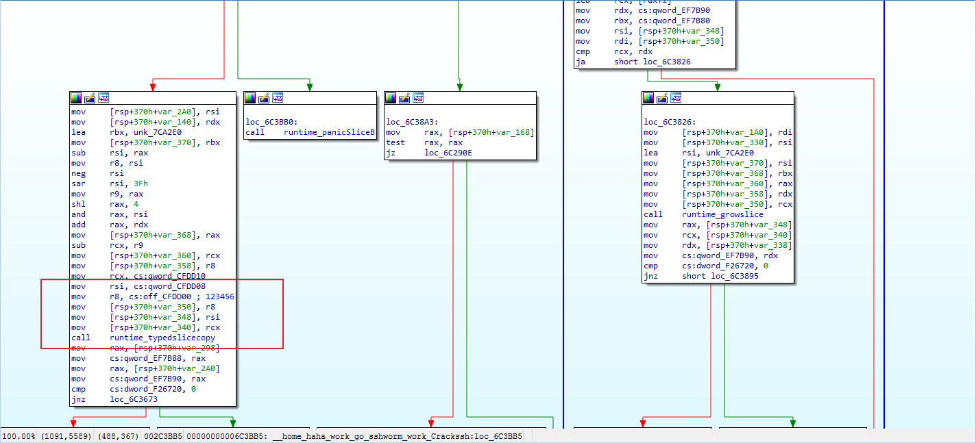 在修改完防火墙规则后,执行__home_haha_work_go_sshworm_work_Crackssh函数,对ssh服务进行Crack: